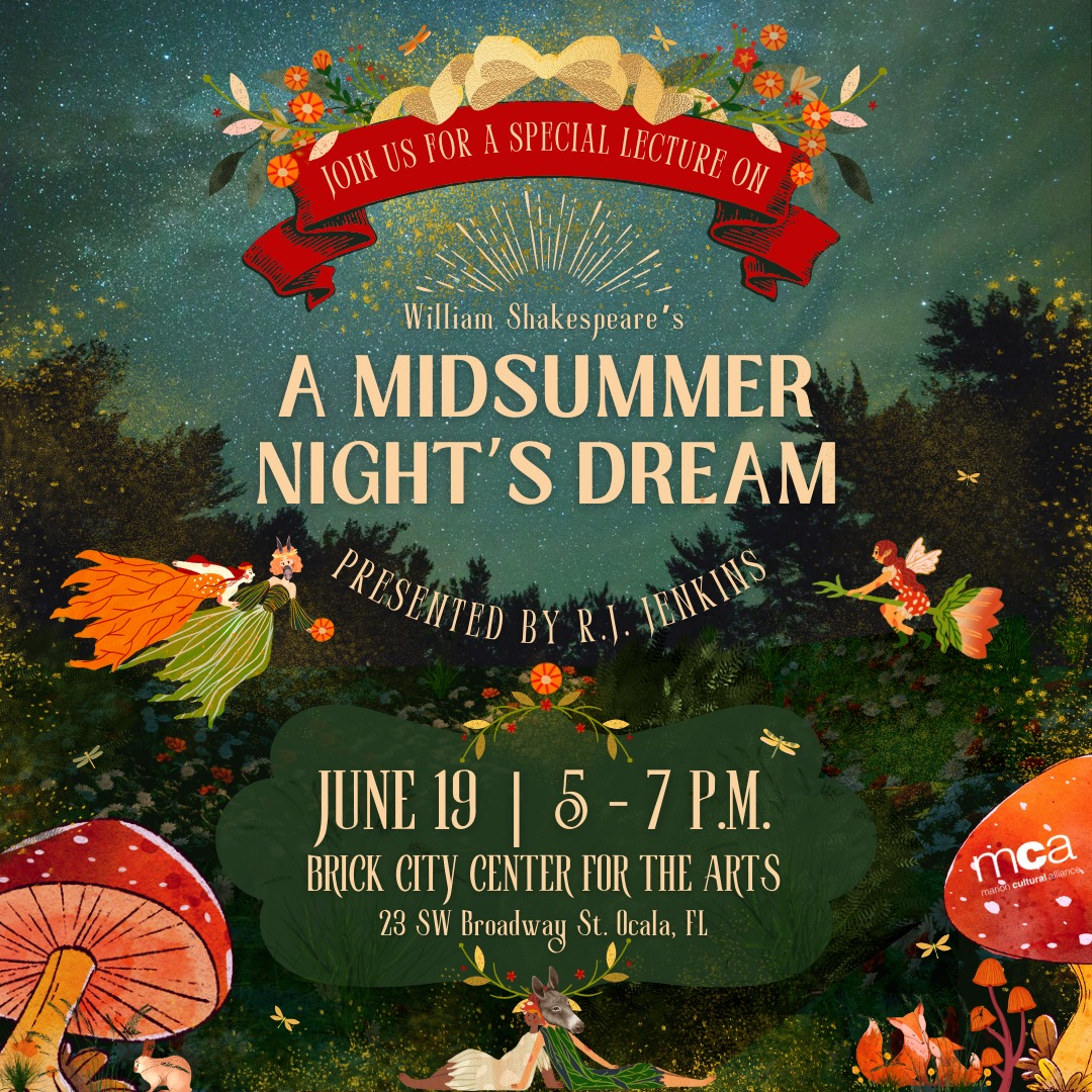 Immerse yourself in the world of Shakespeare's "A Midsummer Night's Dream" with R.J. Jenkins' captivating "no reading required" lecture. Taking place on June 19 at the Brick City Center for the Arts, this event promises to be an unforgettable experience celebrating the arts and literature. Doors will open at 5 pm, lecture begins at 5:30 pm. Complimentary drinks and refreshments will be served throughout the night. RSVP is requested to attend. Don't miss out on this unique opportunity to support the Marion Cultural Alliance and Marion Literacy Council, while indulging in the magic of Shakespeare's timeless masterpiece. Make sure to check out 'Midsummer Dreams' which will be on display at The Brick gallery June 6 through July 7, 2024. Questions? Please contact MCA at 352-369-1500.