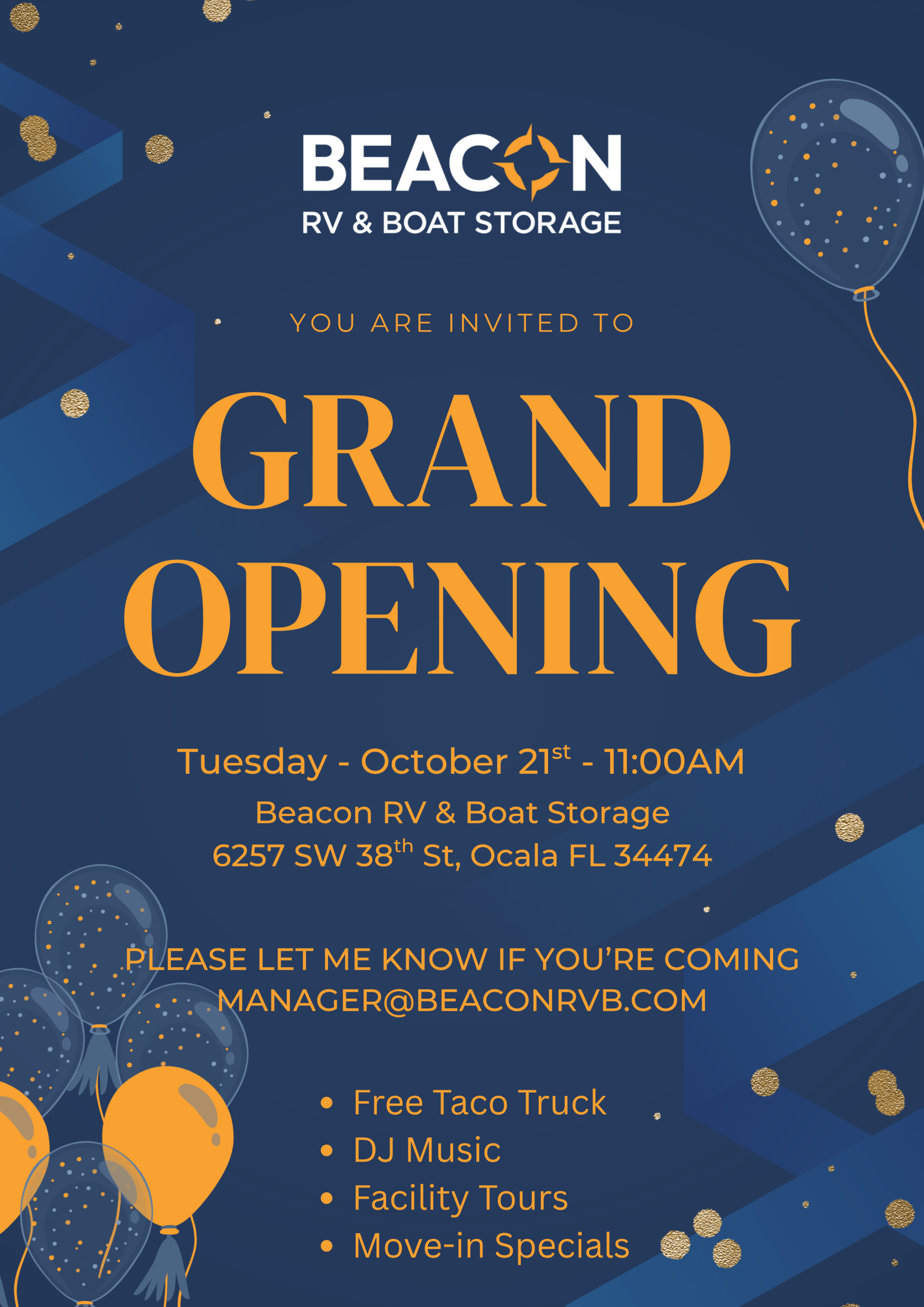 Beacon RV & Boat Storage is celebrating our Grand Opening and you are invited! We will have a Taco truck, a DJ, and a great opportunity to tour the facility and see all the wonderful features that Beacon has to offer our storage clients.