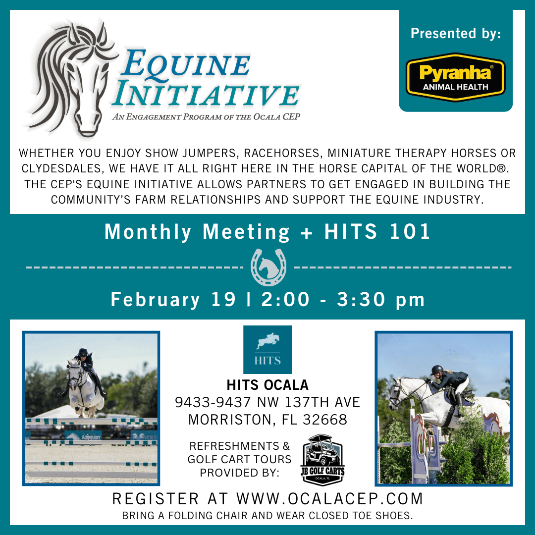 Join us for the ๐๐พ๐๐ถ๐ป๐ฒ ๐๐ป๐ถ๐๐ถ๐ฎ๐๐ถ๐๐ฒ ๐ ๐ผ๐ป๐๐ต๐น๐ ๐ ๐ฒ๐ฒ๐๐ถ๐ป๐ด, presented by Pyranha, on February 19th from 2:00–3:30 p.m. at HITS Ocala. This month’s meeting will include a HITS 101 and golf cart tours of HITS Post Time Farm by JB Golf Carts.