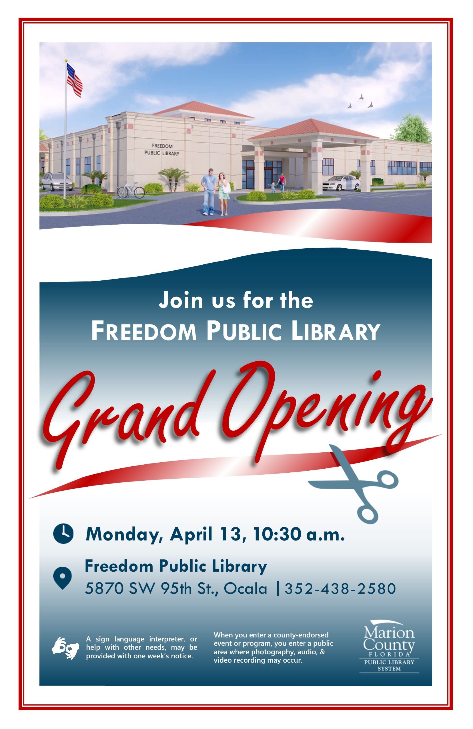 This milestone marks the final step in a project that will transform the Freedom Public Library into a more modern, flexible, and welcoming community destination. The Freedom Public Library will more than triple in size, expanding from 8,100 square feet to approximately 32,000 square feet. Children, teens, and adults will benefit from expanded public service areas, including: Additional shelving space for library books and materials New study rooms and spacious workspaces with more comfortable seating A separate 5,000-square-foot children's area with increased space for age-appropriate programming and a dedicated story time room A larger meeting room to accommodate library programming, early voting, and community engagement A Friends of the Freedom Public Library bookstore offering gently used books, CDs, and other materials, with proceeds supporting library programs and services The public is invited to join the grand opening celebration at 10:30 a.m. on April 13, marking the official reopening of the expanded Freedom Public Library. For more information about library locations and services, visit MarionFL.org/Library.