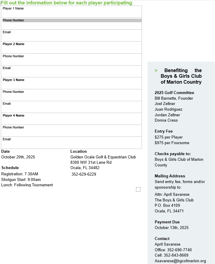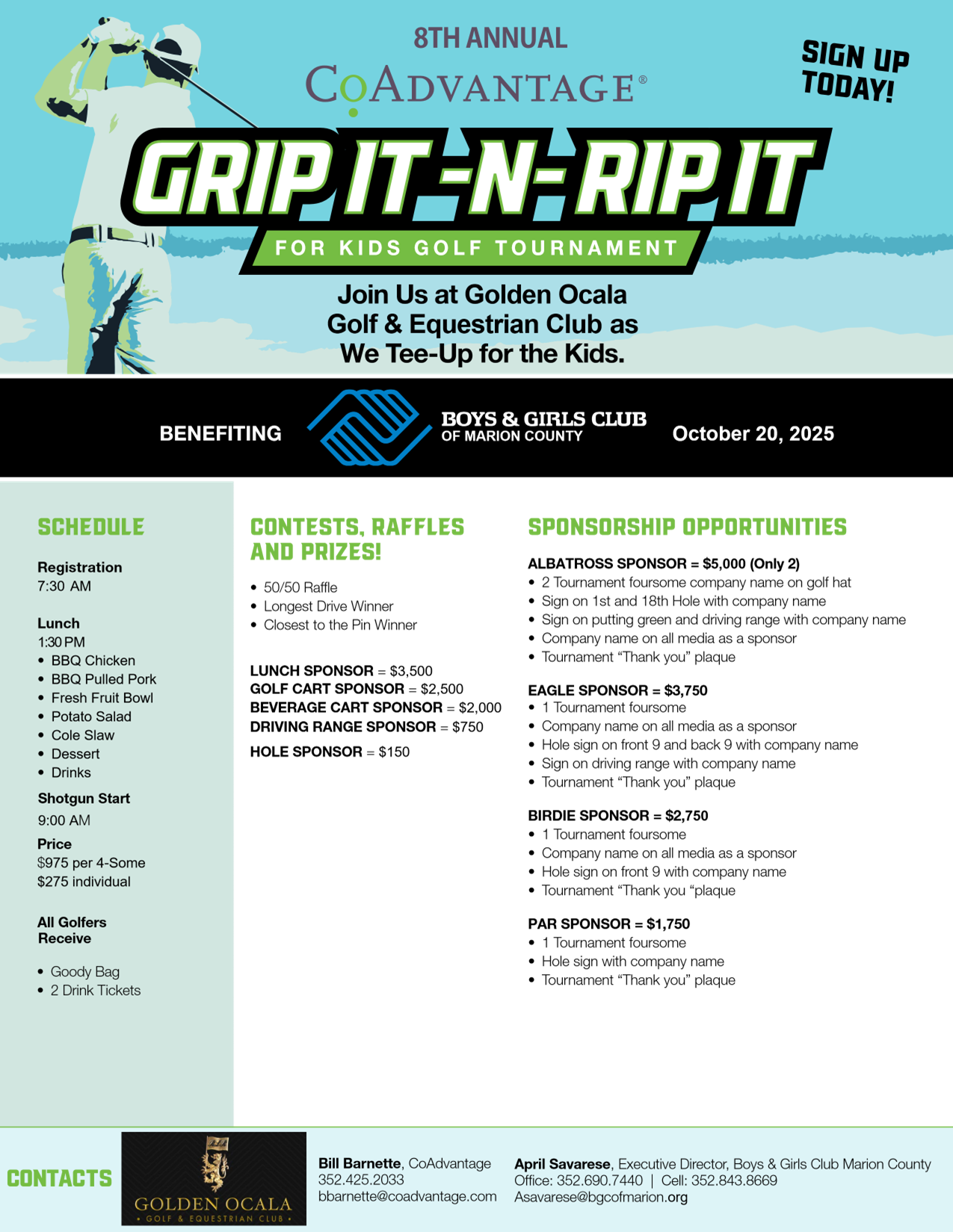 Join the community at the Grip It & Rip It Golf Tournament on Oct 20, 2025 at Golden Ocala Golf & Equestrian Club to support the Boys & Girls Club of Marion County. Registration opens 7:30 AM, shotgun start 9:00 AM. $275/player or $975/foursome; payment due Oct 13.