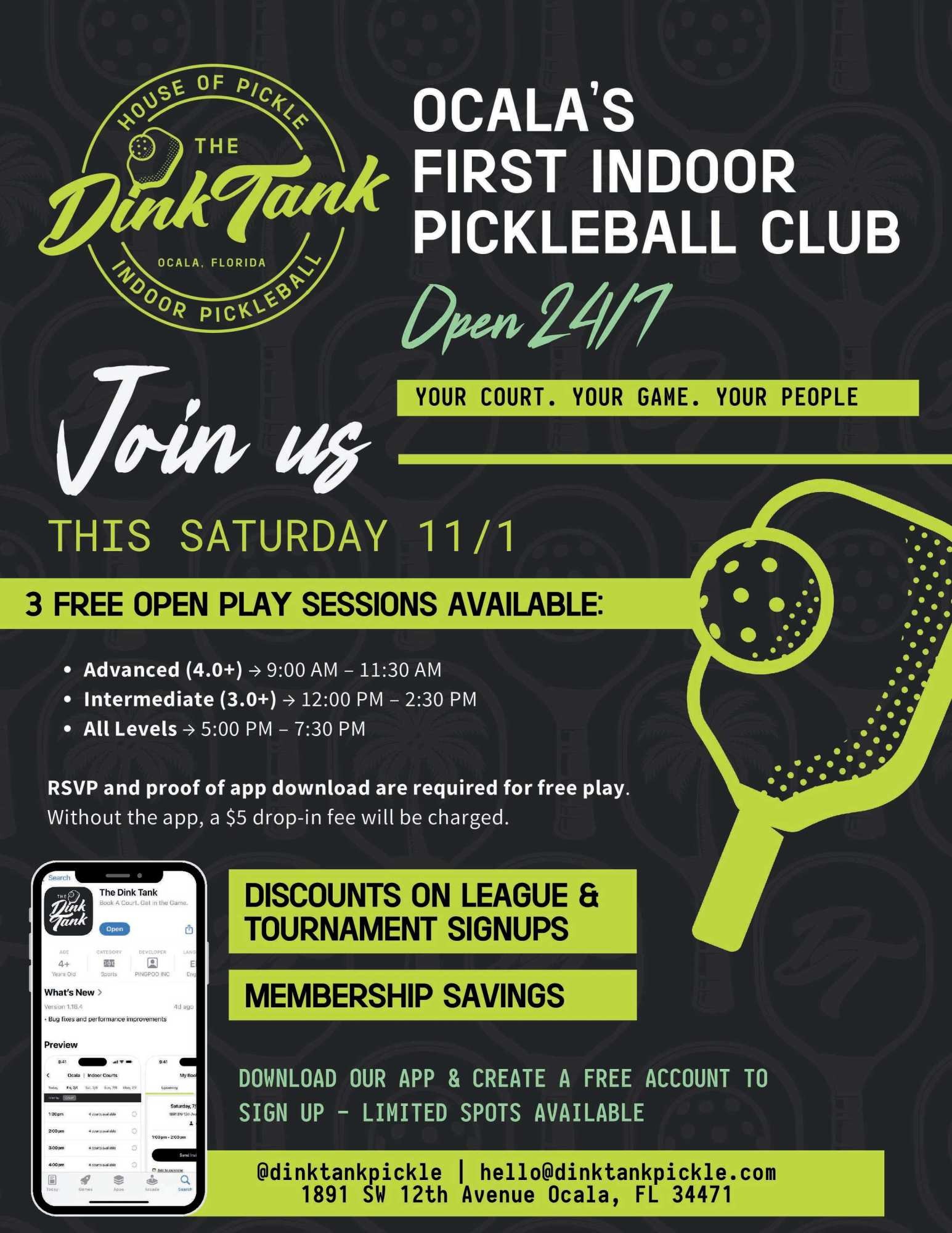 We’re so excited to announce the Grand Opening of The Dink Tank — Ocala’s first 24/7 indoor pickleball club! Join us this Saturday, November 1st, for a full day of complimentary open play, local vendors, and exclusive opening day specials on memberships, leagues, and tournaments. There are three open play sessions to choose from (Advanced, Intermediate, and All Levels), so there’s something for everyone — whether you’re new to pickleball or already obsessed! ✅ RSVP & proof of app download are required for complimentary play (otherwise a $5 drop-in fee applies). 📲 RSVP directly through The Dink Tank app — spots are limited! - https://thedinktank.podplay.app/community/events . Come check out our pro-grade CushionX courts, meet fellow players, and be part of Ocala’s growing pickleball community. We can’t wait to see you on the courts! 💚