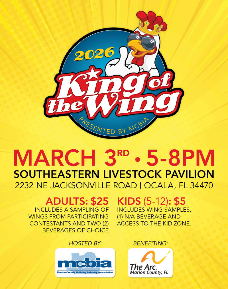 🔥 King of the Wing – Ocala 🔥 Hosted by MCBIA | Benefitting The Arc Marion Get ready, Ocala! 🍗 The King of the Wing Event is heating things up with a fun-filled showdown of the area’s best wings—all for a great cause. Hosted by the Marion County Building Industry Association (MCBIA), this community favorite brings together local businesses, food lovers, and supporters to benefit The Arc Marion, an organization dedicated to empowering individuals with intellectual and developmental disabilities. For tickets--> https://mcbia.org/king-of-the-wing/